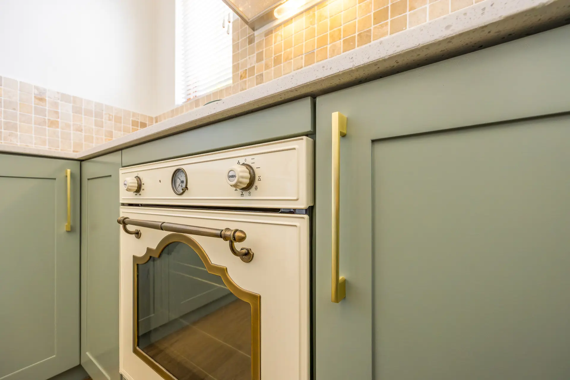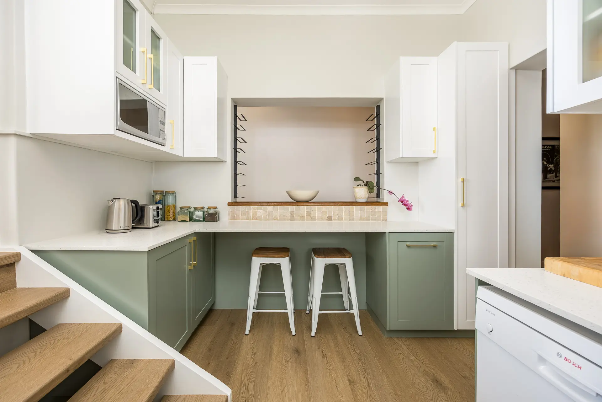 A compact, beautifully designed kitchen featuring Caraz green duco doors paired with elegant Gold Neptune handles. Despite its size, this Cape Town kitchen feels refined and sophisticated. Smart planning and thoughtful detailing ensure the space is fully optimised, offering maximum functionality without compromising on style.